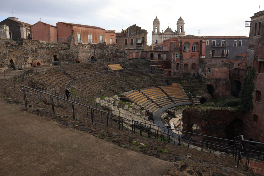 Teatr rzymski w Katanii – podróżując uliczkami Katanii w bardzo łatwy sposób ominąć ten zabytkowy okaz i nie ma w tym nic nadzwyczajnego, ponieważ „ukrywa się” między kamienicami. Rzymski teatr pochodzi najprawdopodobniej z II wieku naszej ery i składa się z teatru większego oraz Odeonu. Prace archeologiczne polegające na odkopaniu i zbadaniu teatru, który przestał działać w V wieku, rozpoczęły się w XVIII wieku. Ukończenie ich nastąpiło natomiast dopiero w 1959 roku. Koszt biletu to 7/3,5 euro. A na szczególną uwagę zasługuje fakt owego „wpasowania się” w otoczenie.