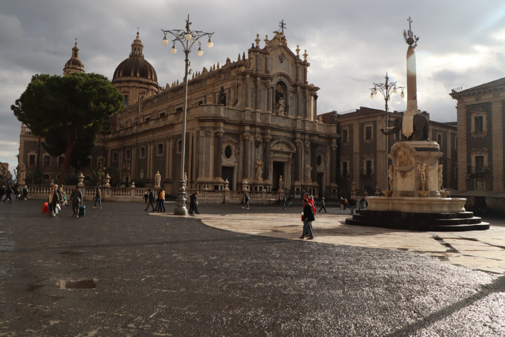 Piazza Duomo – plac katedralny jest tym miejscem, od którego najprawdopodobniej większość rozpocznie swoją wyprawę po mieście. I słusznie, bo znajduje się na nim całkiem sporo do zobaczenia [tutaj skupię się na zarysie placu, pełen opis tego, co znajduje się na placu bądź do niego przylega przeczytacie poniżej]. W jego centralnym punkcie znajduje się fontanna słonia, który na grzbiecie ma słup. Wschodni bok placu zajmuje Katedra św. Agaty, północny bok to Pałac Słoni i wyjście na Via Etna, gdzie przy bezchmurnym niebie można zobaczyć czynny wulkan w pełnej krasie. Zaś w północno-zachodnim narożniku placu znajduje się Fontanna dell’Amenano.
