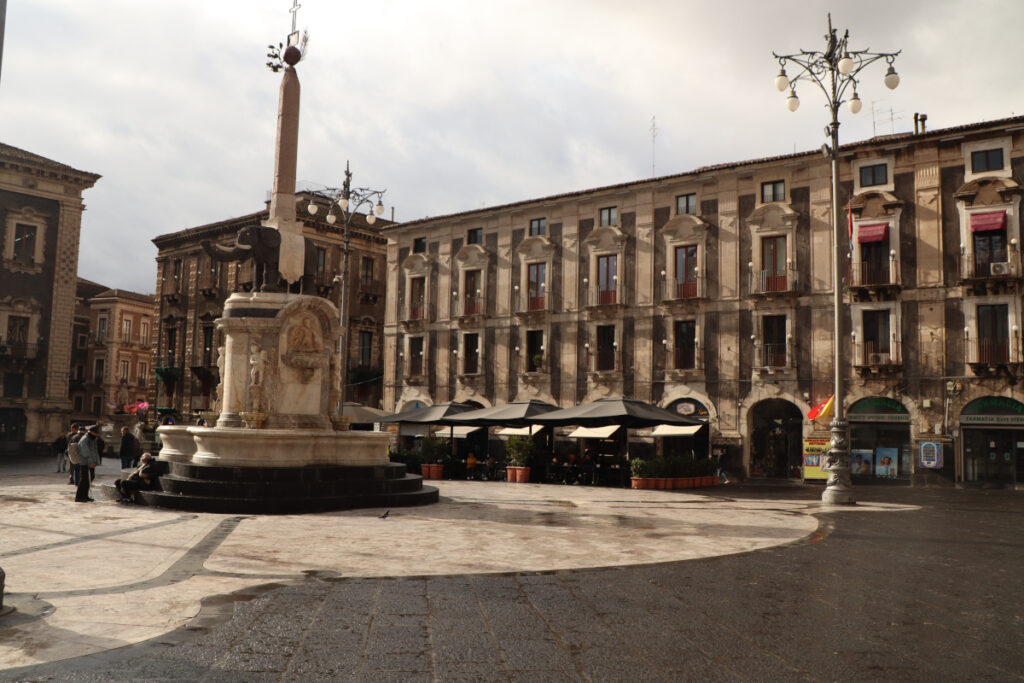 Fontanna słonia – znajdujący się na środku placu katedralnego posąg słonia z obeliskiem w stylu egipskim jest bezapelacyjnie symbolem. Symbolem placu i miasta (od 1239r.). Fontanna stworzona po trzęsieniu ziemi w 1693 roku. Prace ukończone zostały w 1737 roku. Dzisiejsza fontanna to efekt wielu renowacji i przebudów, które miały miejsce na przestrzeni wieków. Był nawet plan przeniesienia fontanny, ale z racji powstania ludowego w 1862 roku pomysł upadł. Słoń wykuty z kamienia lawowego, stojąc skierowany trąbą w stronę katedry, „dźwiga” 3,66 metrowy obelisk ozdobiony figurami egipskimi. Słoń jest częstym punktem orientacyjnym dla wycieczek oraz mieszkańców umawiających się na spotkanie.