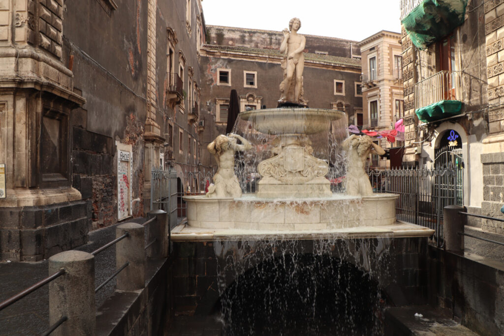 Fontanna dell’Amenano – jest z całą pewnością unikatowa. Osadzona nieprzypadkowo w północno-zachodniej części placu stanowi niejako „bramę” do targu rybnego, który znajduje się za nią. Zbudowana w drugiej połowie XIX wieku przedstawia rzekę Amenano jako młodego mężczyznę trzymającego róg obfitości. Jest to jedyne miejsce, gdzie można zobaczyć tę rzekę, ponieważ obecnie jej bieg jest usytuowany 2 metry pod poziomem placu.