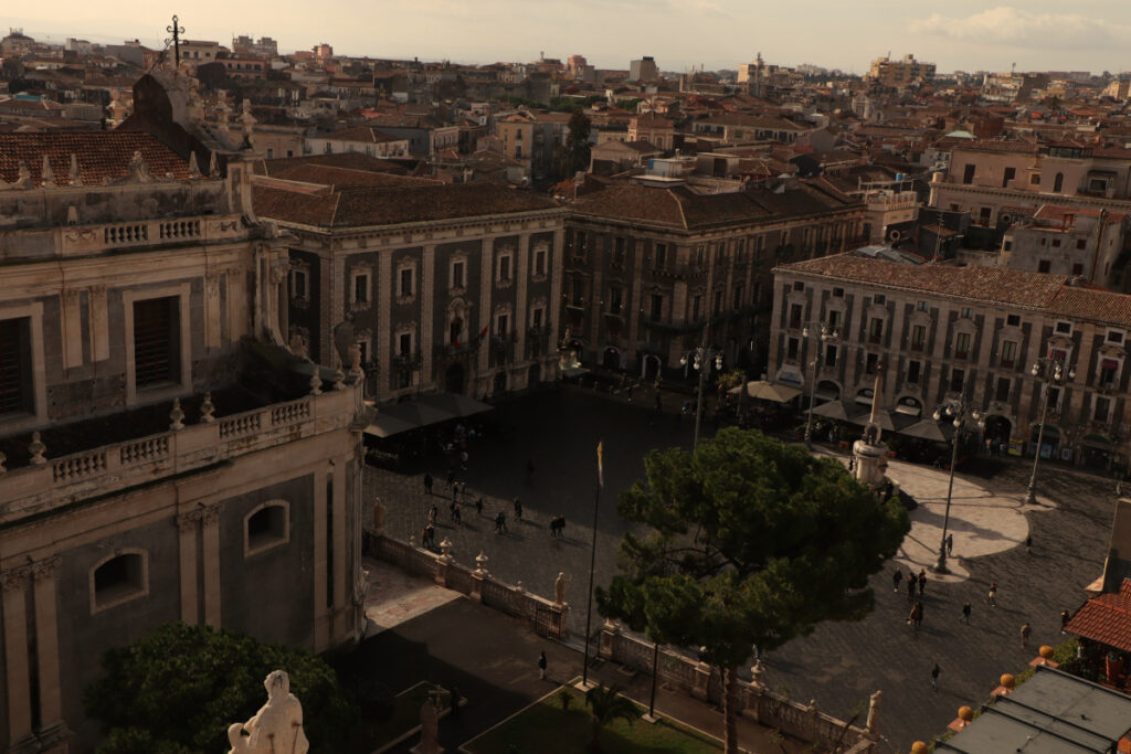 TARAS WIDOKOWY!!!! – by spojrzeć z góry na Katanię, podziwiać morze Jońskie i przy bezchmurnym niebie móc podziwiać potęgę Etny, warto wejść na taras widokowy znajdujący się opodal katedry. Koszt biletu to 5 Euro. W cenie są dwa tarasy widokowe. Jeden – niższy, z bardzo przyjemnym wejściem, gdzie można zobaczyć z lekka panoramę miasta. I drugi – wyższy, na który wiodą kręte schody w górę [osobiście nie mam większego lęku wysokości, ale takich schodów szczerze nienawidzę]. Na drugim tarasie wieje, wiec lepiej zabrać czapkę. I tutaj warto też dodać, że widok jest obłędny!